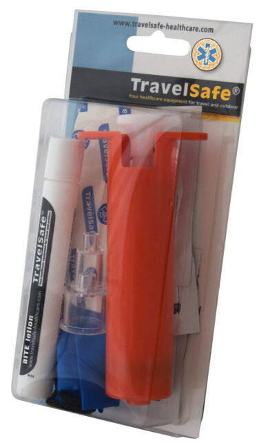Het setje bevat: 1x extractor met 1 zuigmondjes, 1x TravelSafe Bite relief lotion, 4x waterproof pleister, 4x alcohol doekje en een handig bewaar tasje.