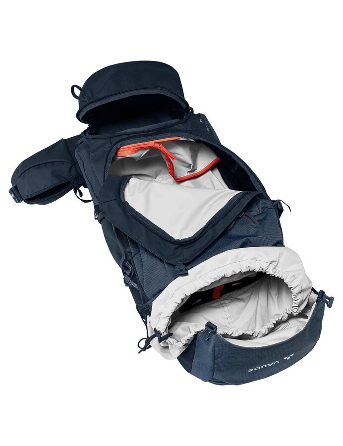 Een veelzijdige dames Vaude trekking rugzak voor huttentochten, alpine trekking en pelgrimsreizen. De Asymmetric 48+8 rugzak heeft een in hoogte verstelbaar en rugontlastend draagsysteem. De verdeling tussen de onderste rugpolstering neemt de druk van het gewricht weg en ontlast op deze manier de onderrug. De ruglengte en lastpostionering kunnen apart worden afgesteld, naar eigen wensen en behoefte maar ook naar lichaamsbouw. Deze dames rugzak heeft een kort rugpand, speciaal gevormde schouderbanden en voorgevormde heupriem. Het bovenvak is in hoogte verstelbaar. Het biedt dan ook extra rugzakvolume. Het voorvak is op verschillende manieren toegankelijk, het extra bodemvak kan gebruikt worden op vuile spullen te scheiden van schone items en de materiaallussen bieden je de mogelijkheid om items op een veilige manier aan de buitenkant van de tas vast te maken.