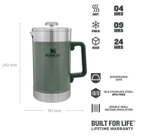 Maak snel en eenvoudig koffie voor iedereen met deze Stay Hot French Press van Stanley. Deze franse pers beschikt over een filter dat de koffieresten uit de vers gezette koffie zal houden. Dit roestvrijstalen gaasfilter zorgt ervoor dat je keer op keer kunt genieten van zuivere koffie. Met de vacuümisolatie blijft de koffie heet totdat je ervoor kiest om het daadwerkelijk te schenken. De koffie zal 4 uur warm, 9 uur koud en 24 uur ijskoud blijven wanneer de pers goed is afgesloten.